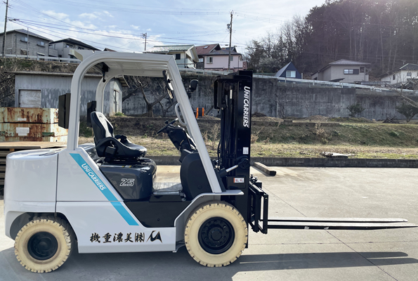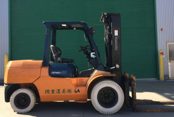 | 5tフォークリフト | ・ハイマスト最大5mの揚程がとれます。 ・走行時はフルフリーにより天井が低いところでも作業可能です。 |