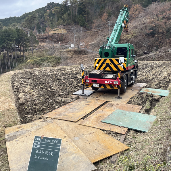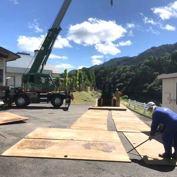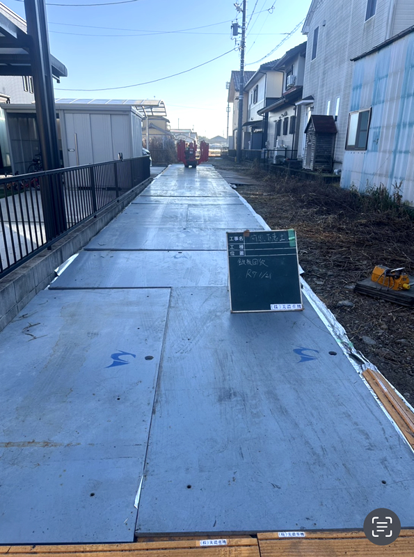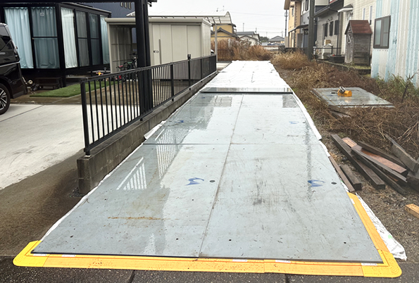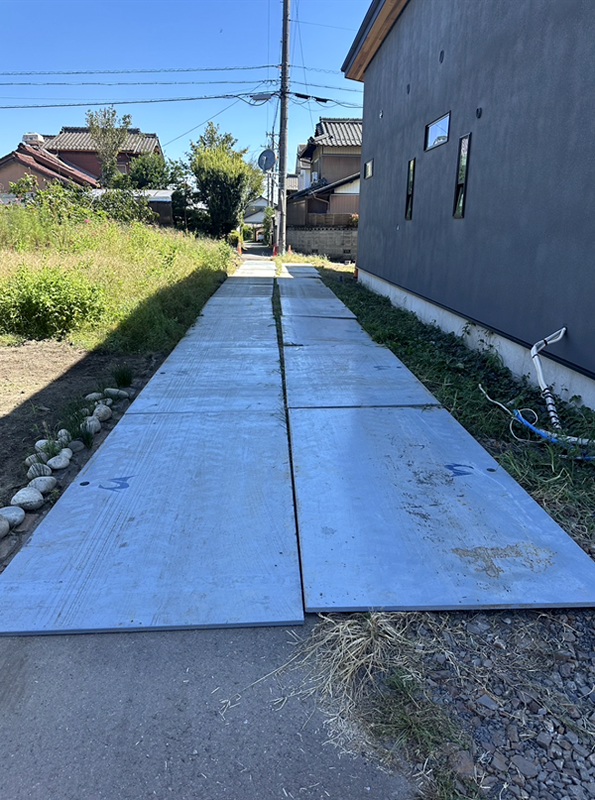 敷鉄板リースも行っております。 工事進入道路、仮設用道路、軟弱地盤覆工、作業場養生などに使用できます。 各現場への貸出対応を行っております。貸出し金額等はお問い合わせください。